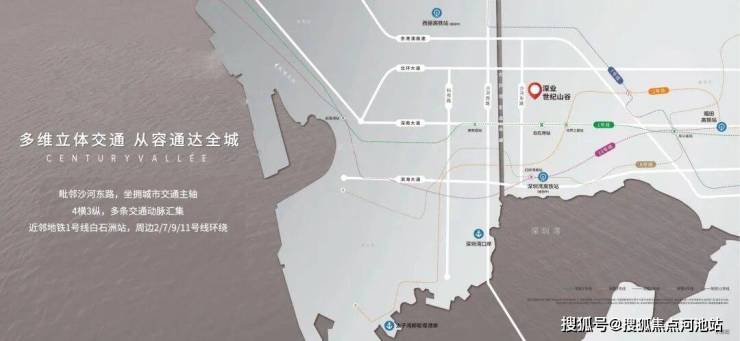 五轨四横三纵多枢纽:项目毗邻沙河东路,950米达深南大道;驾车1.5公里进入北环大道,坐拥城市交通主轴,与总部经济圈紧密相连,近邻地铁1号线白石洲站,1站到达高新园,周边五轨环绕,纵横湾区主场,从容通达世界。
