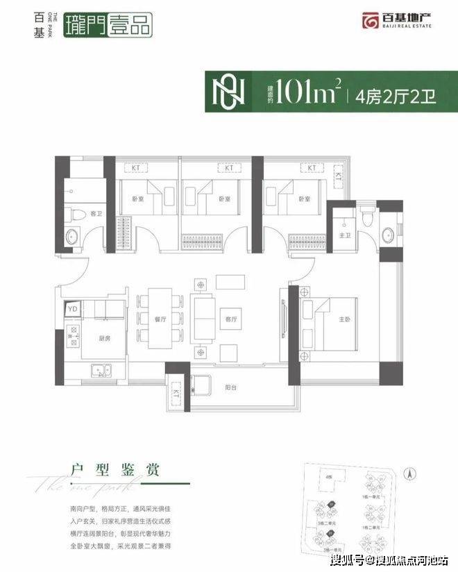 101㎡的4房2厅2卫,设计的是横厅南北通透格局,进门入户玄关,LDKB一体化设计,U型厨房,卫生间干湿分离,阳台主朝东南向。