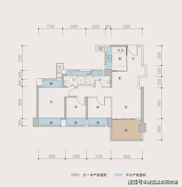 89㎡3房横厅户型使用率,赠送面积达到了22.92㎡,地毯率达到了92.57%,套内加赠送使用率能达到102.58%。