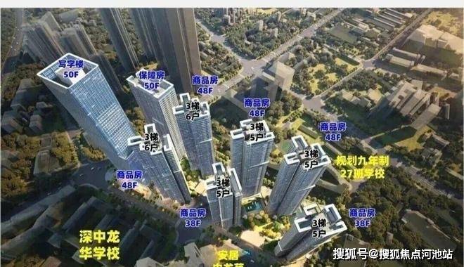 中交国润华府,由中交集团打造,总占地面积约3.72万㎡,总建筑面积约40万㎡,计容建筑面积约29.9万㎡,容积率8.0,分2个地块开发,共由7栋38-50层高住宅+1栋写字楼组成,其中商品房住宅38-48层,1栋保障房50F,1栋写字楼50F,规划有1所12班制幼儿园。注意楼层数暂定,还不是最终方案。
