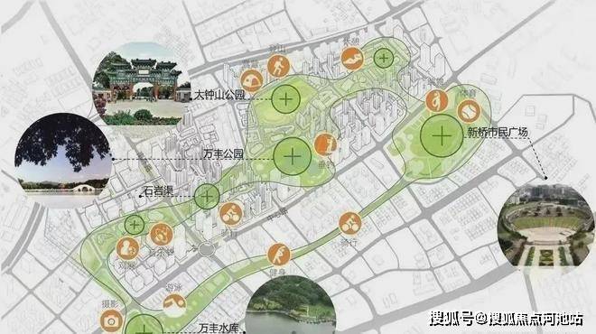 以新桥市民广场、大钟山,石岩渠、万丰水库。立新水库等绿色生态资源为基础搭建”生态绿环+城市绿芯”生态色框架,打造“线性公园”+“节点公园”公共开放空间体系,形成10公里生态绿环创造了片区居民多样化的居住休憩生活方式。