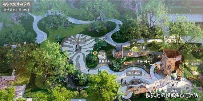 ③ 园林景观:约1万㎡全龄无界都市景观园林,含约500㎡轻运动中心(元气营地运动场)、约400㎡无界亲子多元互动型泳池(自然水岸游泳池)、约1500㎡大叶王国主题儿童游乐场(达尔文营地游乐场)、每户楼栋单元门前定制入户庭院(庭院花园);