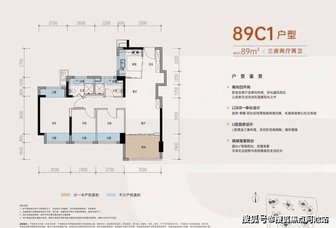 89㎡的3房2厅2卫,C2户型,设计的是竖厅格局,进门入户玄关,客厅3.5米开间,LDKB一体化,S墙设计预留冰箱卡槽位,四开间朝南,动静分区,主卧南北双飘窗,全屋7面飘窗,3个卧室分别做到了主卧16.6㎡/次卧9.18㎡/次卧8.16㎡(包含墙体飘窗),U型厨房,卫生间干湿分离,得房率约:96.4%(包含赠送),东南或西南朝向。