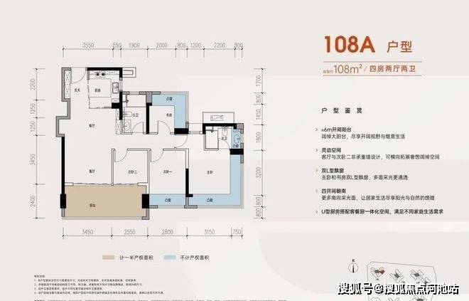 108㎡的4房2厅2卫,A户型,设计的是竖厅格局,进门入户玄关,客厅3.45米开间,LDKB一体化,S墙设计预留冰箱卡槽位,四开间朝南,动静分区,主卧+1个次卧270度大飘窗,客厅连接次卧出6米长大阳台,4个卧室分别做到了主卧16.4㎡/次卧11.2㎡/次卧7.84㎡/次卧6.25㎡(包含墙体飘窗),U型厨房,卫生间干湿分离,得房率约:105%(包含赠送),东南朝向。