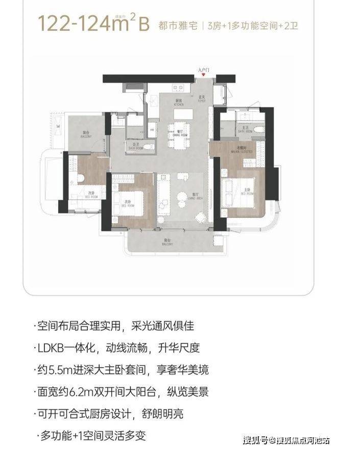 金地环湾城二期开盘加推户型,T 6 栋3单元(4 梯 6 户),本次首批推出T6共222套住宅,面积有约111㎡的3房和约122-124㎡的3+1多功能空间。