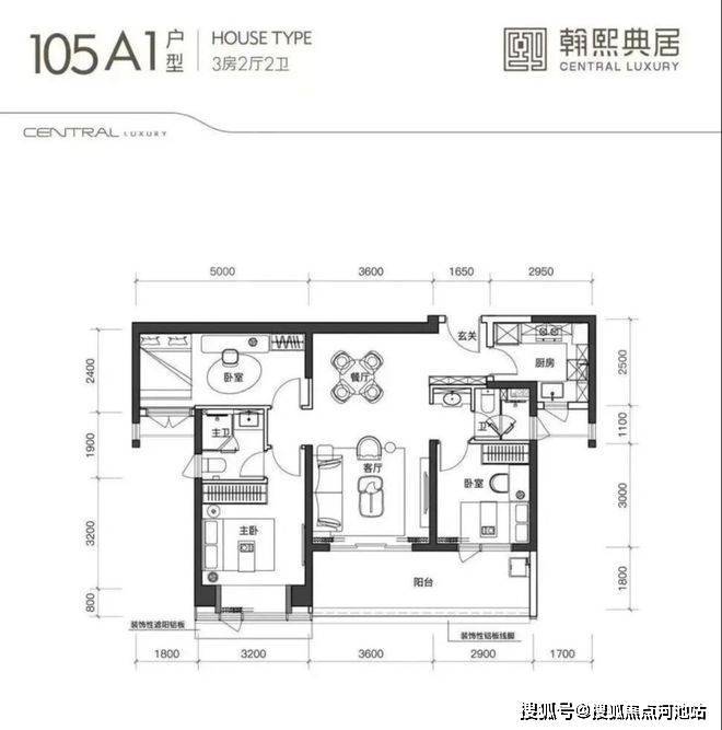 经典的双龙抱珠布局,主人空间与客卧空间互不干扰,具备私密性优势。并且户型方正,实用三房两厅两卫。朝南向四开间面宽共约 13.2m,全明空间,采光极佳。这个户型含赠送半阳台和飘窗的面积后使用率可达约 83%,这在超高层中是比较高的使用率。