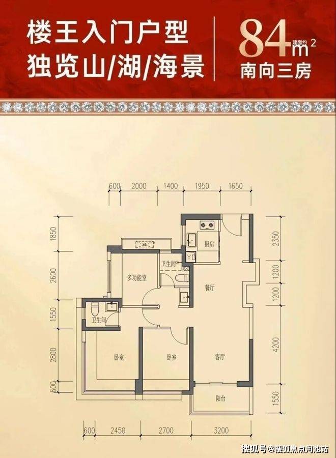 84㎡的3房2厅1卫,设计的是竖厅格局,客厅3.2米开间,LDKB一体化,S墙设计预留冰箱卡槽位,3个卧室分别做到了主卧10.37㎡/次卧9.18㎡/次卧7.54㎡(包含墙体飘窗),U型厨房,卫生间三段式分离,得房率约77%(不含赠送),东南或者西南朝向。