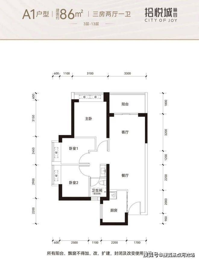 建面86平米:3房2厅1卫,传统的竖厅动静分区格局;刚需紧凑型三房,功能间都齐全,但是空间有限,典型的‘麻雀虽小,五脏齐全’,一个卫生间不是槽点,市面3房1卫的户型太多,预算有限的情况下这是最好的选择;86平米客厅开间只有3.3米,客厅显得有些局促,三个房间的大小还可以。