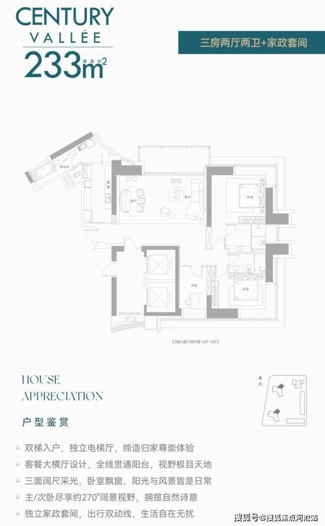 ③稀缺大平层,舒适梯户比及纯粹大户型社区,8梯3户,层高3.5米,车位比1:1.25。