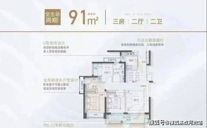 建面约91㎡,两户对称、传统经典竖厅、三房两卫,LDK一体化布局,动静分区、室内动线清晰、预留凹形嵌入式冰箱位、功能间布局合理,6.25米宽景阳台+3飘台+2设备平台大幅增加了可使用面积,相较于81㎡户型,它的整体尺度要舒适一些,更适合改善居住。周边配套已经很成熟。