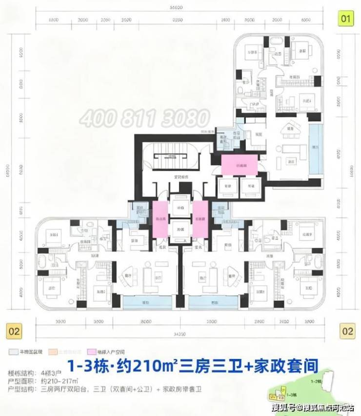 - C 栋:建面约 210㎡,层高 3.3 米,精致三房户型,约 120 余套;