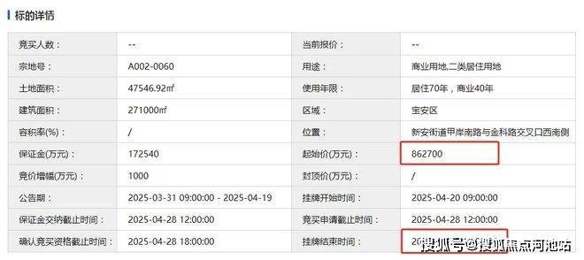 总用地约4.75万平,总建面超过27万㎡,容积率为5.7,起拍价86.27亿元。