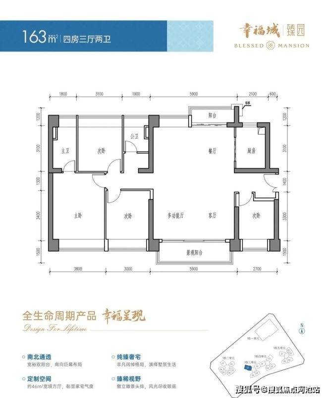 163㎡的4房3厅2卫,设计的是横厅南北通透格局,进门入户玄关,客厅5.9米开间,餐厨一体化设计,南北双阳台,全屋7个飘窗面,4个卧室分别做到了主卧20.14㎡/次卧12㎡/次卧11.47㎡/次卧10.43㎡(包含墙体飘窗),客厅出5.9米长的观景大阳台,U型厨房,公卫三段式分离,得房率约88.25%(包含赠送),阳台主朝西南向。