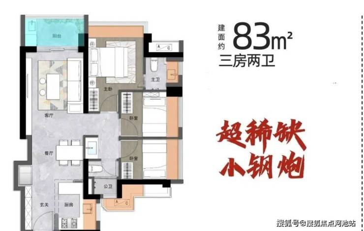 80㎡三房一卫(总价396万起)、89㎡三房两卫(439万起),小面积多房间设计,堪称刚需“神户型”