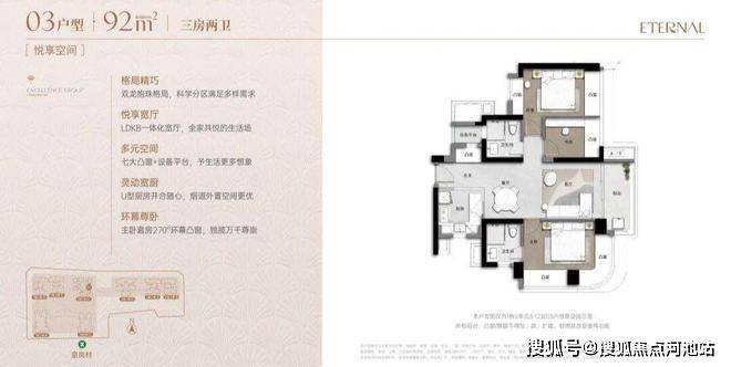 「卓越缦悦」首推的西地块(一期)的1-5栋,面积段为约92-105-123-126-173㎡的3-4房,5梯6户(实质为173㎡做2梯2户专梯入户 + 其余户型3梯4户)。户型是新规设计,作为旧改项目来说,使用率还是相当不错。