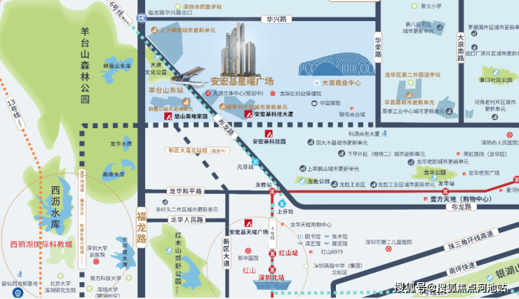 安宏基星曜广场项目位于深圳市龙华区中核,西望羊台山,毗邻地铁6号线,三站可达中心区,具有得天独厚的交通优势。星曜广场为建面约17万方标杆综合体,集萃写字楼、商业、住宅、产业园于一体。