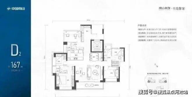 167㎡的5房2厅3卫,1栋02/2栋03高区户型,电梯入户送独立公区,设计的是竖厅双龙抱珠格局,四开间朝南,超宽敞客厅巨幕阳台,主卧大套间设计,U型厨房,双公卫三段式分离,得房率:72.07%(不含赠送),西南朝向。