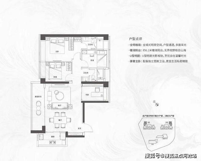【124㎡的3+1房2厅2卫】1栋02/2栋04户型,电梯入户送独立公区,设计的是竖厅格局,动静分区,主卧套间设计,还有一个多功能间可以做书房,U型厨房,公卫三段式分离,得房率:72.07%(不含赠送)西南朝向;