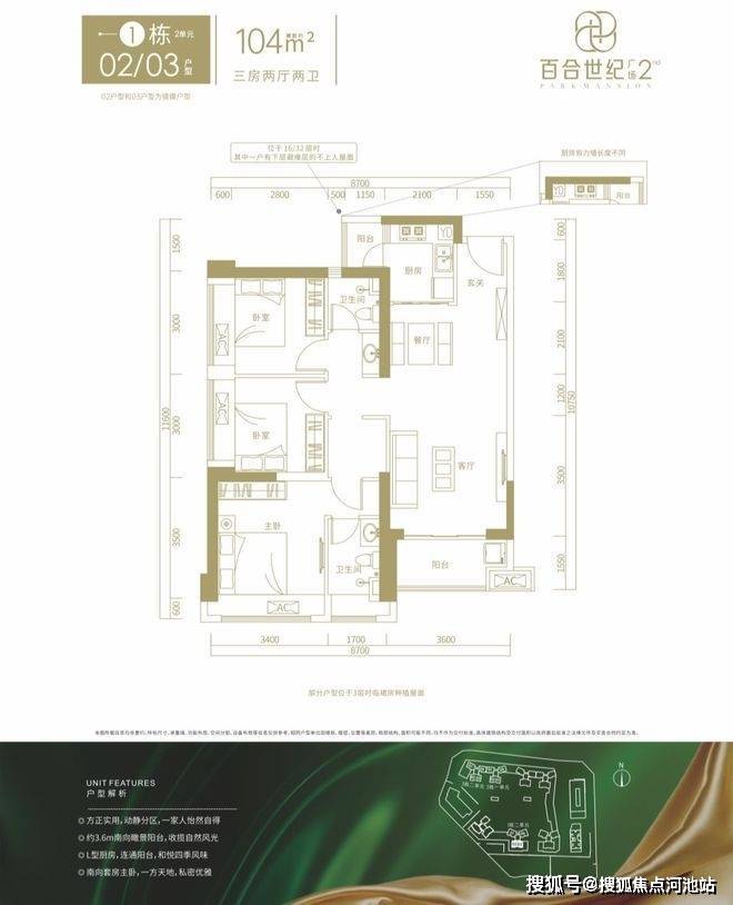 1栋02/03户型,设计的是竖厅格局,客厅3.6米开间,LDKB一体化设计,三开间朝南,动静分区,正南朝向。