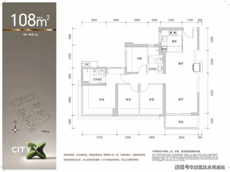 108㎡的4房2厅2卫,1栋2/3单元02/1栋1单元06户型,设计的是经典竖厅格局,进门入户玄关,客厅3.6米开间,LDKB一体化,S墙设计预留冰箱卡槽位,四开间朝南,动静分区,4个卧室分别做到了主卧16.2㎡/次卧9.24㎡/次卧7.76㎡/次卧7.32㎡(包含墙体飘窗),U型厨房,公卫三段式分离,得房率约90%(包含赠送),东南或西南朝向。