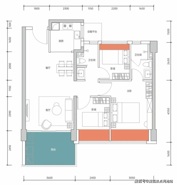 88㎡的3房2厅2卫,设计的是经典竖厅格局,客厅3.6米开间,LDKB一体化设计,三开间朝南,动静分区,3个卧室分别做到了主卧14.26㎡/次卧7.81㎡/次卧5.83㎡(包含墙体飘窗),客厅出8.67㎡的大阳台,U型厨房4.95平,公卫三段式干湿分离,得房率约86-90%(包含赠送),正南朝向。