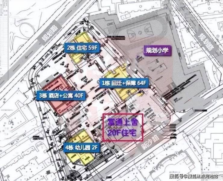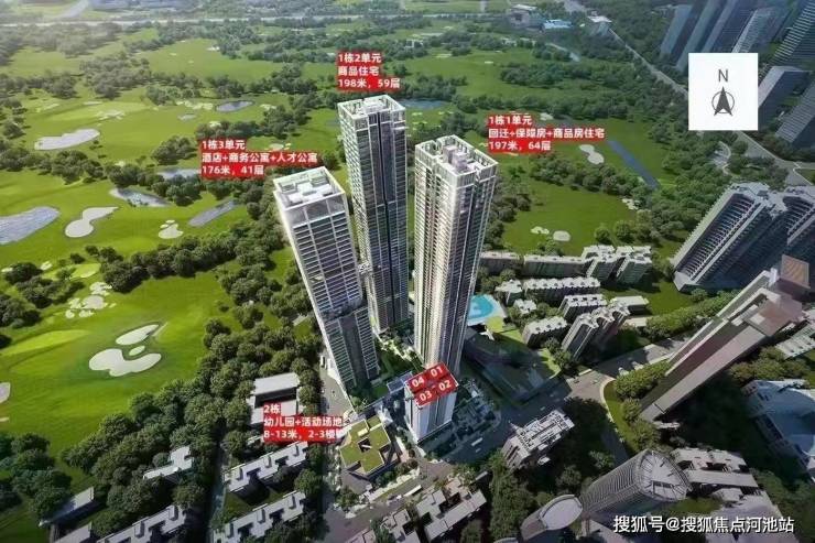 本项目位于深圳市福田沙头街道新沙路18号(新沙路北侧),项目由3栋超高层建筑及1栋多层建筑构成,包含回迁房、保障房、商品住宅、酒店及商务公寓等业态,配建一所幼儿园,旁边规划建设一所小学。1栋由回迁房与保障性住房组成,64层加地下3层,楼高196.8米。2栋为商品住宅,59层加地下5层含两层半地下室,楼高189.15米。3栋由酒店、商务公寓、人才住房组成,40层加地下4层半地下室,楼高172.85米。本期销售住宅有260户,其中户型套内建筑面积小于90㎡为230套,占比88.46%。
