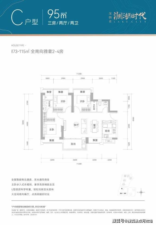 95㎡的3房2厅2卫,设计的是横厅南北通透格局,客餐厅一体化5.8米开间,3个卧室分别做到了3.2米/2.9米/2.9米的宽度,主卧套间设计,U型厨房,卫生间干湿分离,得房率77-78%(不含赠送),阳台主朝西南或东南向。