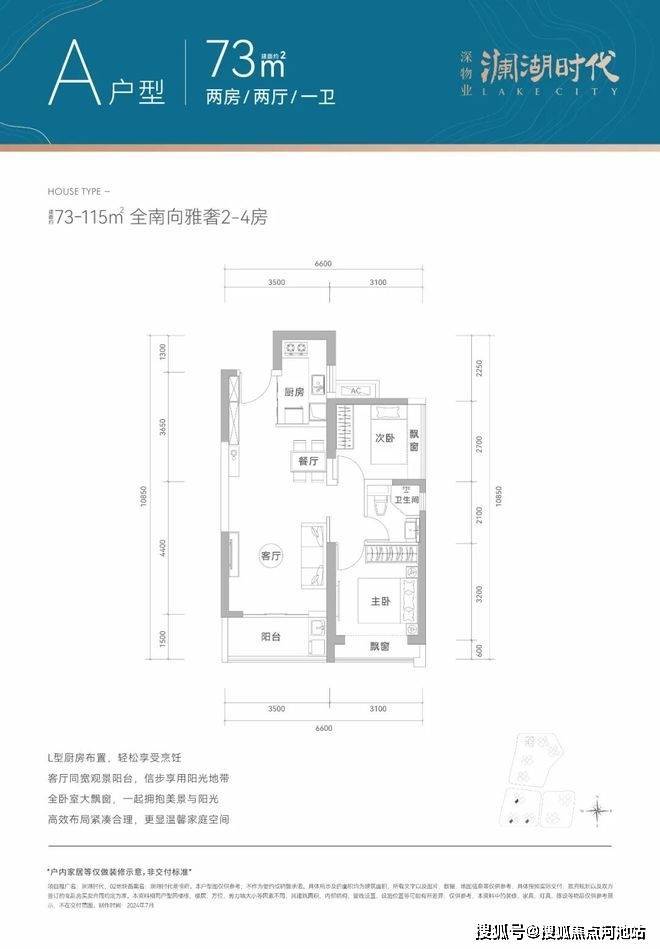 73㎡的2房2厅1卫,设计的是竖厅格局,客厅3.5米开间,LDKB一体化设计,2个卧室分别做到了3.1米/2.7米的宽度,L型厨房,卫生间干湿分离,得房率77-78%(不含赠送),阳台都是西南朝向。