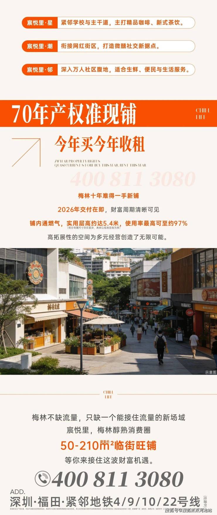 结尾:以上就是关于深圳福田宸悦里楼盘商铺项目最新图文介绍和说明,在此感谢您的认真阅读,希望为您的购房置业选择上提供帮助。如果您还想咨询了解宸悦里认购优惠、按时签约优惠、贷款优惠、一次性优惠、团购折扣等信息,欢迎联系宸悦里楼盘开发商售楼处全国400免费服务热线电话Tel:400 811 3080(中介或自媒体请勿扰),另外温馨提醒一下,因近期营销中心参观商铺采取预约制,为了不影响您的行程,过来楼盘实地看房之前请记得拨打开发商400热线进行预约,预约看房的话还可以尊享楼盘内部额外优惠,最终价格包您满意!