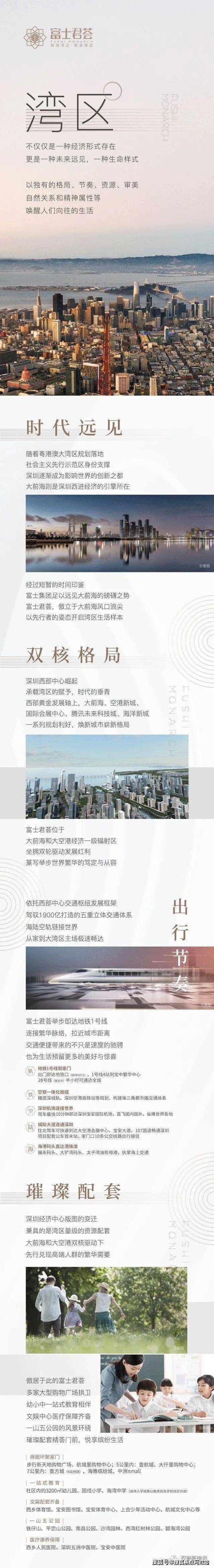富士君荟沿用经典ArtDeco现代风格,交互式景观设计,规划为中高层、商业、高端酒店、商务公寓、幼儿园等业态复合体,项目承接海绵城市新城市建设理念,区域内近海依山,公园景观环绕,实现自然生态、智慧科技、高端时尚、人文社区共生共融,营造未来智慧城市的理想人居,近观海之余晖,远看山之悦色,安享风雅静逸的人生境界。