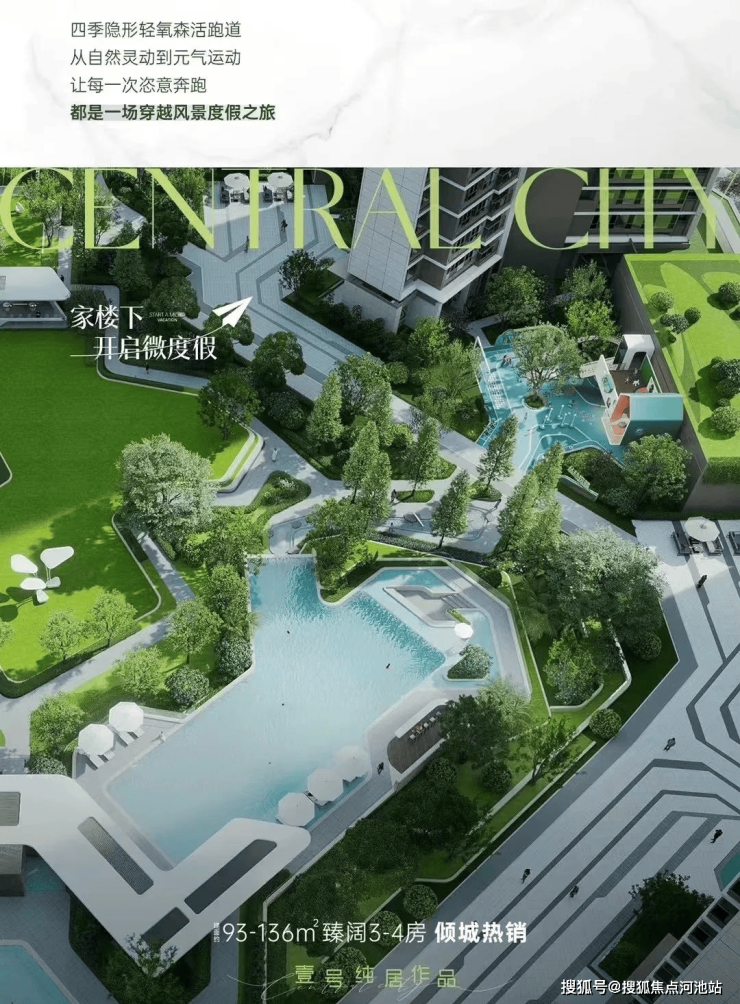 2. 园林景观:约1.6万㎡的超大中央公园式园林是项目一大特色。园林通过局部下沉式地下庭院、覆土绿化,并设置了一段小巧的商业内街,构建出功能复合、多维立体的景观空间。此外,项目巧用架空层打造了近1300㎡的运动文化场地,配备摩登泳池、森系儿童乐园、四季隐形轻氧跑道、球类场地等丰富配套。
