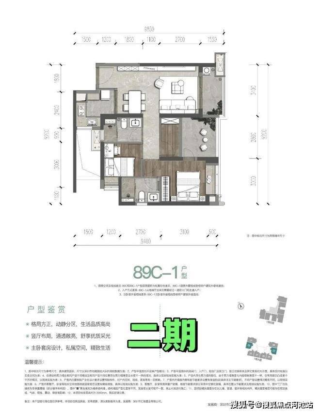 89㎡的3房2厅2卫(二期C户型),设计的是经典竖厅格局,餐客厅一体化,客厅3.4米开间,三开间朝南,3个卧室分别做到了3米/2.8米/2.4米的宽度,U型厨房,阳台1.5米进深,得房率:72.96%(不含赠送),西南朝向。