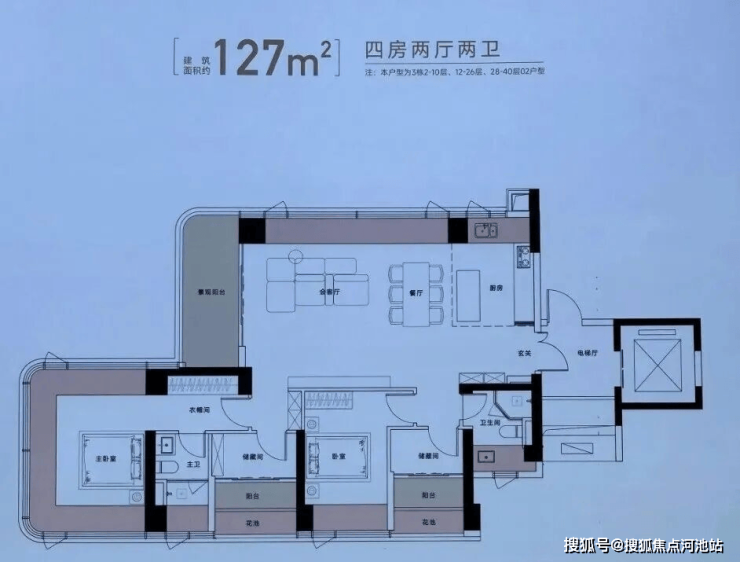 建面约129㎡户型,得房率约105%(包含赠送),东北朝向看一线梧桐山景观。跟127㎡户型只差了2㎡,格局却千差万别。