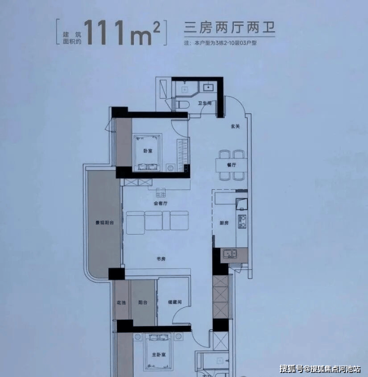建面约111㎡户型,得房率约94%(包含赠送),西北朝向看一线梧桐山景观。跟102㎡户型布局有点像,也是长条形……