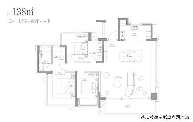 较大的南地块,则排布了3栋A、B座以及4栋。这里边3栋A座43层,3栋B座31层,4栋46层。四栋楼均是一层四户的设计。