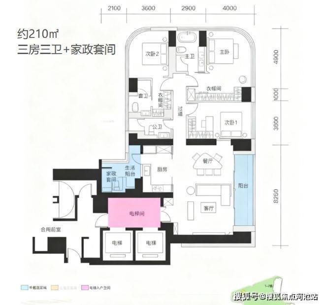 210㎡户型,梯户比为4梯3户。