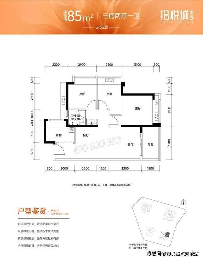 约85m²三房两厅一卫; 折后总价299万-313万;