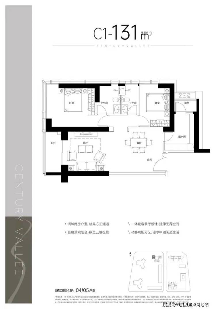 约131㎡两房两厅两卫双阳台,户型方正 全明设计