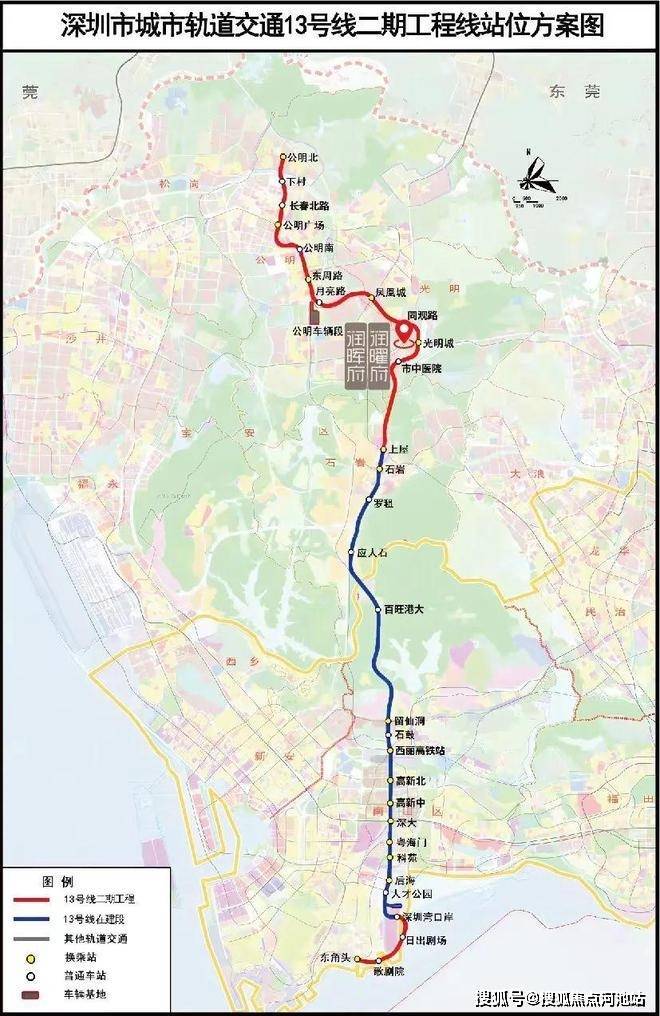 二期工程——从上屋站向北延伸,串联光明城站、光明凤凰城新区,至光明公明街道公明北站。从深圳湾口岸站向南延伸,到东角头站与深圳地铁2号线换乘。