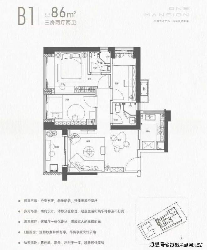 建面约86㎡这个户型方正通透,动线明朗,进门后客餐厨阳基本连成一线,大大拉伸了空间感,把约86㎡房子的客厅使用面积做到了约19㎡,至少匹敌市面上一般约100-120㎡户型的客厅空间。高楼层大主卧,还能一览阳台山美景,集休憩、观景、沐浴于一体,私密性极好