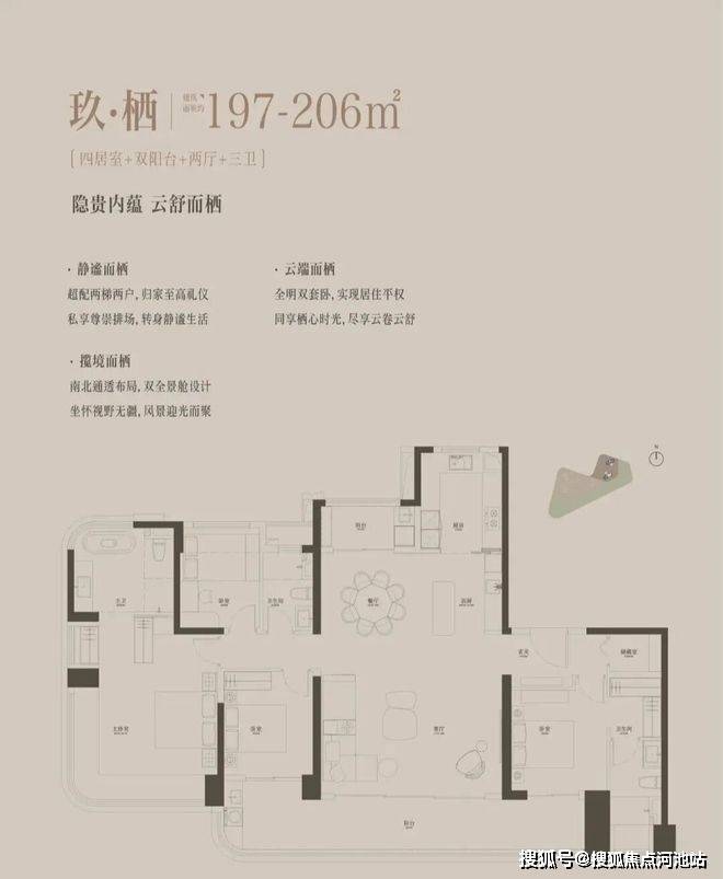 197㎡四房三卫,折后总价区间973-1262万,单价区间4.93-6.39万/㎡;
