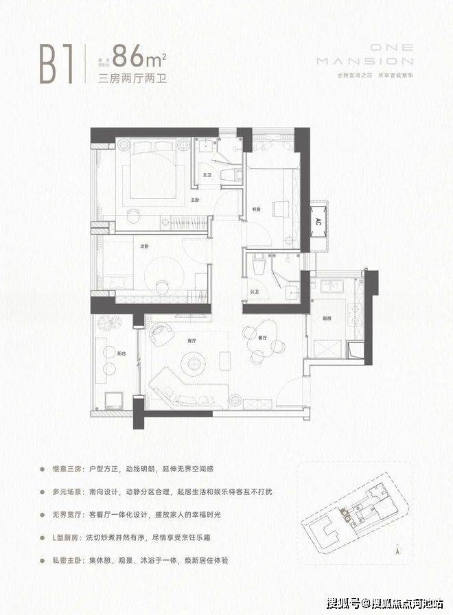 建面约86㎡这个户型方正通透,动线明朗,进门后客餐厨阳基本连成一线,大大拉伸了空间感,把约86㎡房子的客厅使用面积做到了约19㎡,至少匹敌市面上一般约100-120㎡户型的客厅空间。高楼层大主卧,还能一览阳台山美景,集休憩、观景、沐浴于一体,私密性极好。
