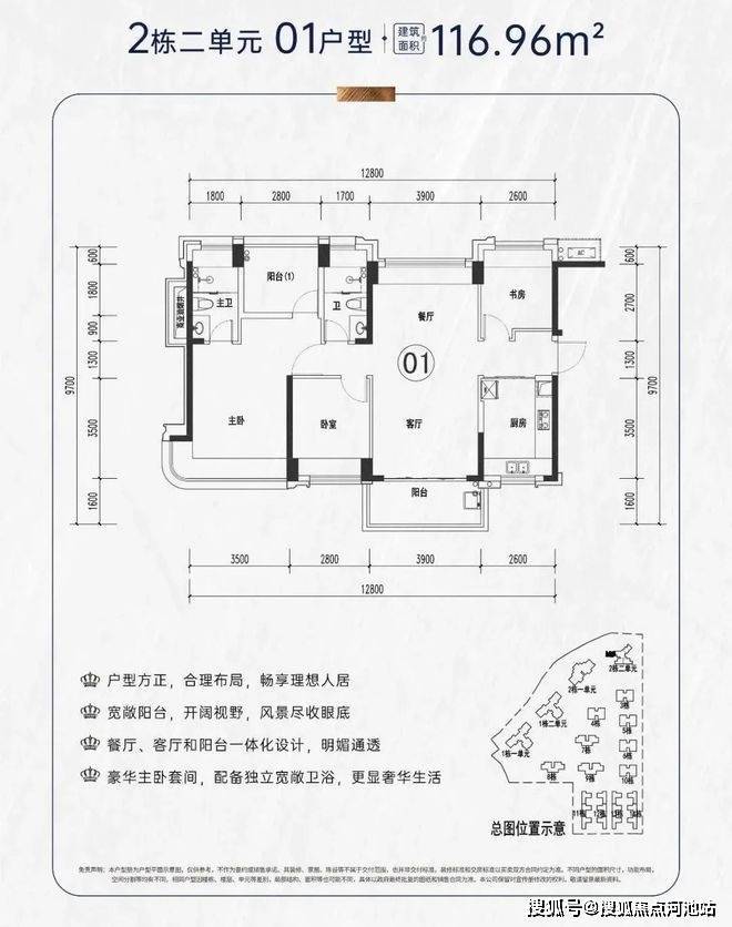 项目容积率2.6,停车超1:1,三梯四户。高层分布于1栋2单元、2栋2单元。其中112平和120平的户型是3+1房,195平的户型是4+1房。