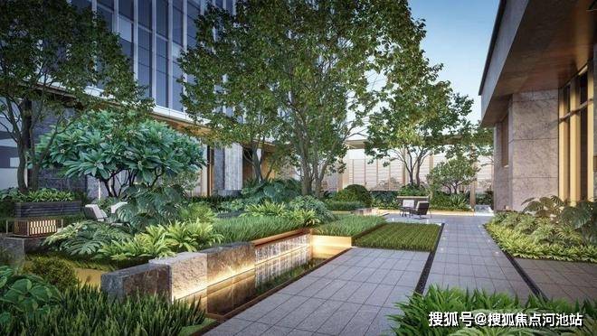 行至绿荫漫游环线,新加坡式美学园林,一步一景的布局方式,上层乔木葱郁成荫,漫游过程尽享格调会客庭院、草坪剧场、森氧社交体验。