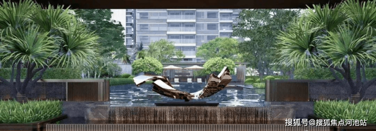 泳池入口设计了穿孔不锈钢雕塑,以三片水流捧着散落星光做出"繁星"造型,泳池池底定制繁星艺术瓷砖,拼贴成流动星河图案,同时配备水下星星灯、池壁灯,延展出无边际泳池的效果。