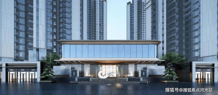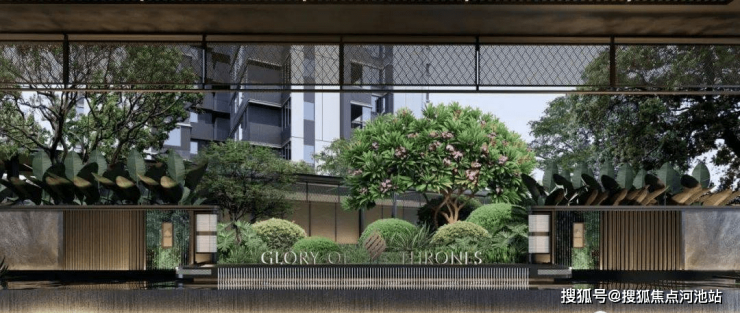 小区大门整体以“皇冠”为造型打造。搭配汉白玉雕塑、安哥拉黑大理石、罗汉松,紫山水奢石,带给业主尊贵的第一道归家礼序。