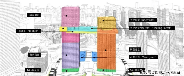 项目总占地面积约33.6万m²,规划总建筑面积约110万m²,涵盖商务、生态办公、高档住宅、国际都荟住宅、酒店、公寓、商业休闲、运动娱乐、幼儿园和国际学校等业态。为前海综规划在建的综合体中规模最大、容积率最低的项目。