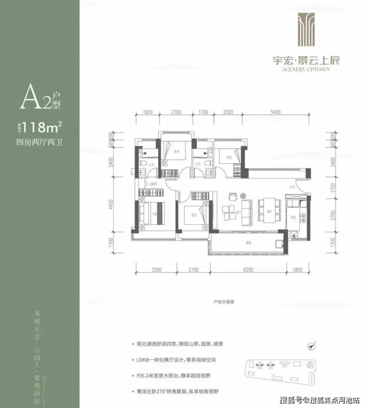 118㎡的4房2厅2卫,设计的是横厅南北通透格局,客餐厅6.2米开间,LDKB一体化,五开间朝南,西北面5.4米长的观景大飘窗,4个卧室分别做到了3.3米/2.7米/2.7米/2.3米的宽度,客厅连接餐厅位出6.2米长的大阳台,L型厨房,卫生间干湿分离,得房率约76%(不含赠送),东南朝向。