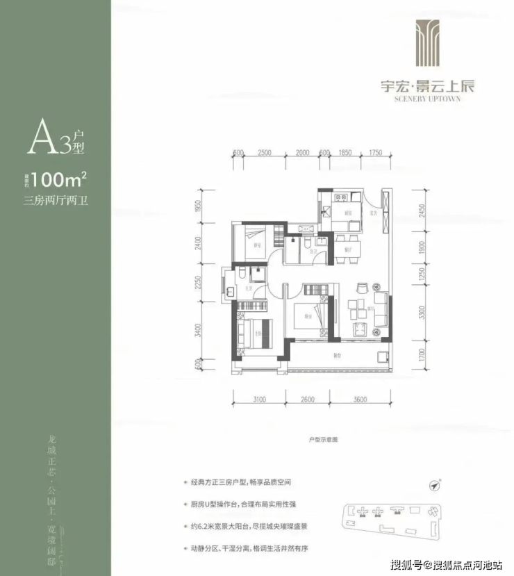 100㎡的3房2厅2卫,设计的是竖厅格局,客厅3.6米开间,LDKB一体化,三开间朝南,3个卧室分别做到了3.1米/2.6米/2.4米的宽度,客厅连接次卧出6.2米长的大阳台,U型厨房,卫生间干湿分离,得房率约76%(不含赠送),东南朝向。