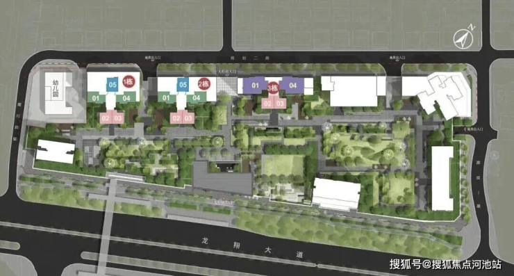 从规划效果图来看,项目共有3栋可售住宅、1栋回迁房、1栋人才房租赁、2栋公寓、1栋回迁公寓、1栋幼儿园。